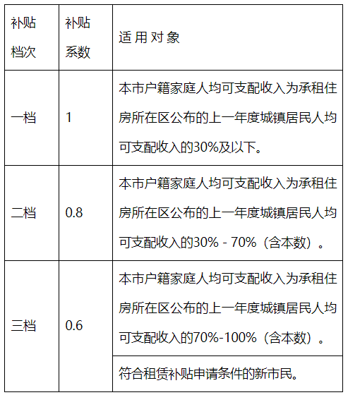 根据保障人数的不同,保障面积对应为:1人30平方米,2人45平方米,3人及以上60平方米。补贴分3个档次发放,补贴标准由各区结合本区住房租赁市场租金水平、人均住房面积等因素自行确定,并实行动态调整。