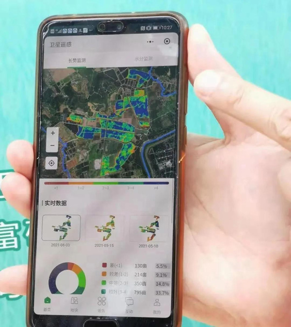 打开这个卫星遥感数据图,可以看到水稻在哪个位置的生长,反映出来的蓝色区域是生长得比较好,绿色代表是一般,红色区域代表比较差,整个农田的生长情况都了解到,假如生长较差,系统会指导找出原因。