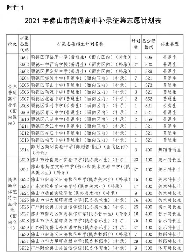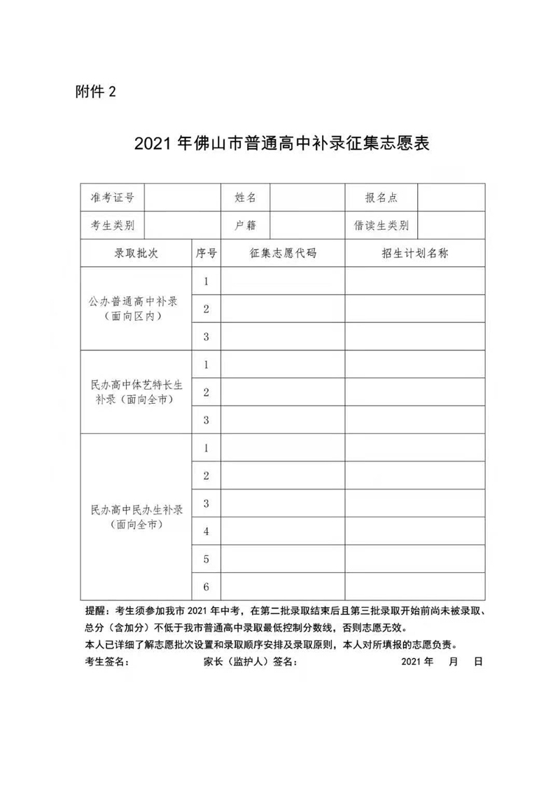 根据《佛山市2021年高中阶段学校招生考试工作意见》,在第二批录取结束后,市教育局将根据公办民办普通高中招生计划剩余情况,在其核定公布的总招生计划内确定补录计划(计划未完成作废的除外)。市招生办划定录取最低控制分数线并公布计划,经批准补录的公办民办高中在规定时间内通过佛山市中考信息管理系统,公办高中面向区内、民办高中面向全市尚未被录取的考生统一征集志愿。