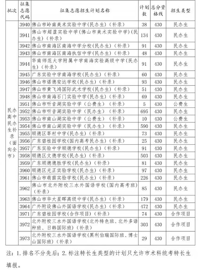 记者留意到,在补录征集志愿计划表中,南海区公办高中学校由于全部招满,并没有补录名额,民办高中除了听音湖实验中学和南山湖实验中学两所新办高中外,南海中学分校、超盈实验中学、南海省实、南海华附、石门实验中学、诺德安达学校、黄飞鸿国际武术学校等南海民办高中面向全市招收普通生;超盈实验中学、南海执信中学、南海省实等南海民办高中面向全市招收体艺特长生。