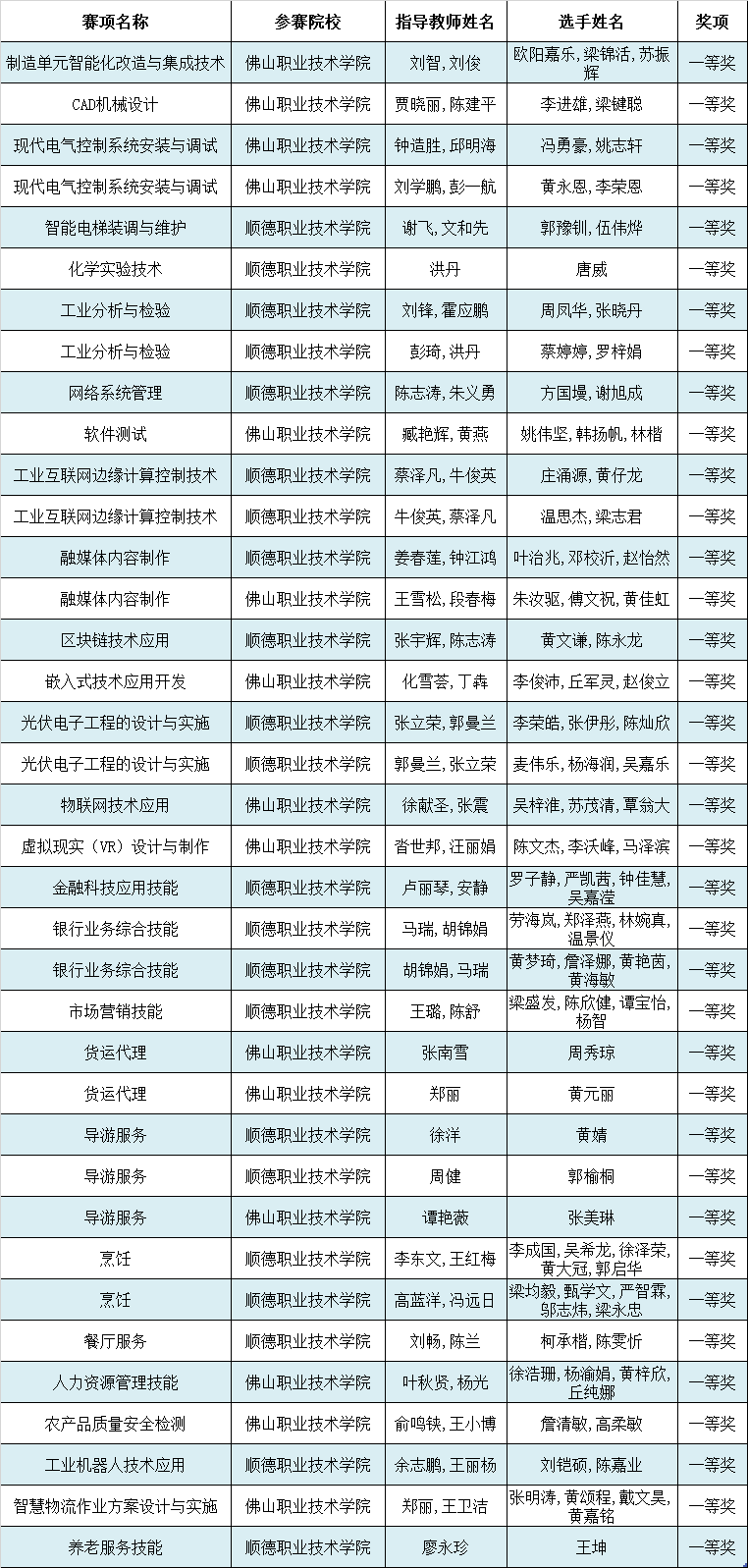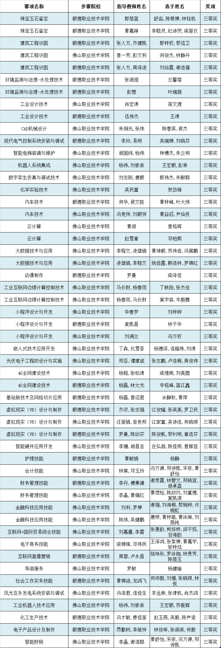 高职组方面,顺德职业技术学院、佛山职业技术学院共揽下138个奖项,包括一等奖37个,二等奖49个,三等奖52个。