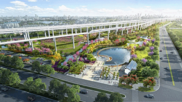 建设地块位于武广、贵广、南广高速铁路高架桥下,南北长约3.6km。构建以自行车道、跑步道和绿地等综合而成的融合体育元素、湿地元素、铁路文化元素的公共休闲景观园区,受到国家铁路局、住房和城乡建设部、交通运输部等部门的认可,是全国较为少有的高铁沿线公园建设的示范性项目。项目建设期限为21个月。