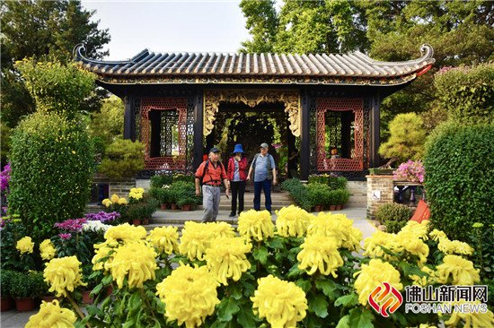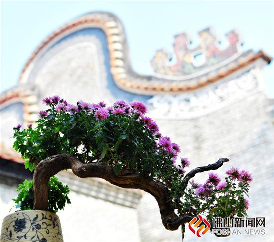 满园盛放的七彩菊花,与苏氏书塾传统岭南风格的锅耳山墙、青砖灰瓦、石磨板砖,配合得天衣无缝,美轮美奂,相得益彰,成为禅城区文化休闲的好去处。