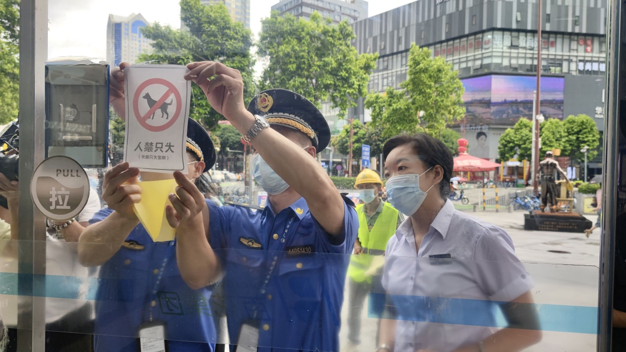 上午10点,记者跟随执法人员来到百花广场,许多市民对商场正门显眼处张贴的“犬只禁入”标识感到好奇。“张贴‘犬只禁入’标识对市民来说有很好的提醒作用,我平时会带小孩进商场,孩子对狗比较好奇,很喜欢摸它。如果犬主没留意,狗咬到人或把谁绊倒都挺危险的。”市民王先生看到后,对此表示赞赏。