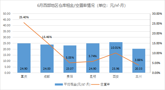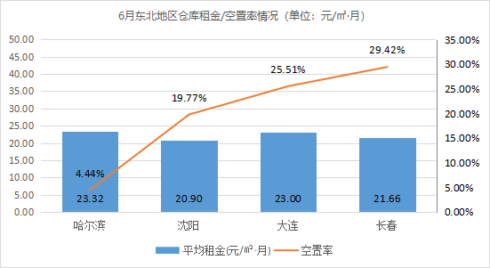 全国32个城市仓库平均空置率为11.29%,环比上升0.11个百分点。其中,东北地区仓库空置率(19.78%)远高于西部(10.92%)、中部(10.24%)、东部(9.71%)地区。相较5月,东部、东北、中部、西部地区仓库空置率相对稳定,升(降)幅变化在±1个百分点以内。