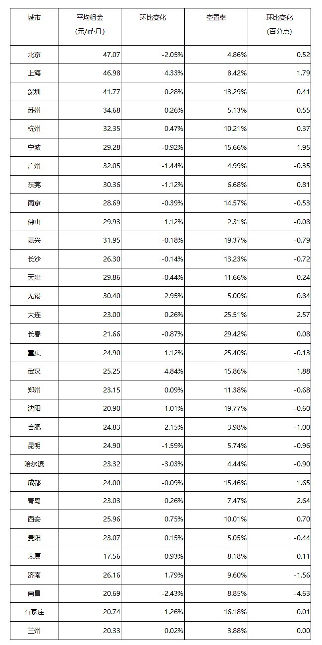 全国32个城市仓库空置率波动最大的城市是南昌,空置率环比下降4.63个百分点,6月南昌规模以上工业增加值增长10.9%,工业生产稳中向好,使得本月日化、五金等行业租赁需求旺盛,仓库去存化加速,使得仓库空置率有所下降。