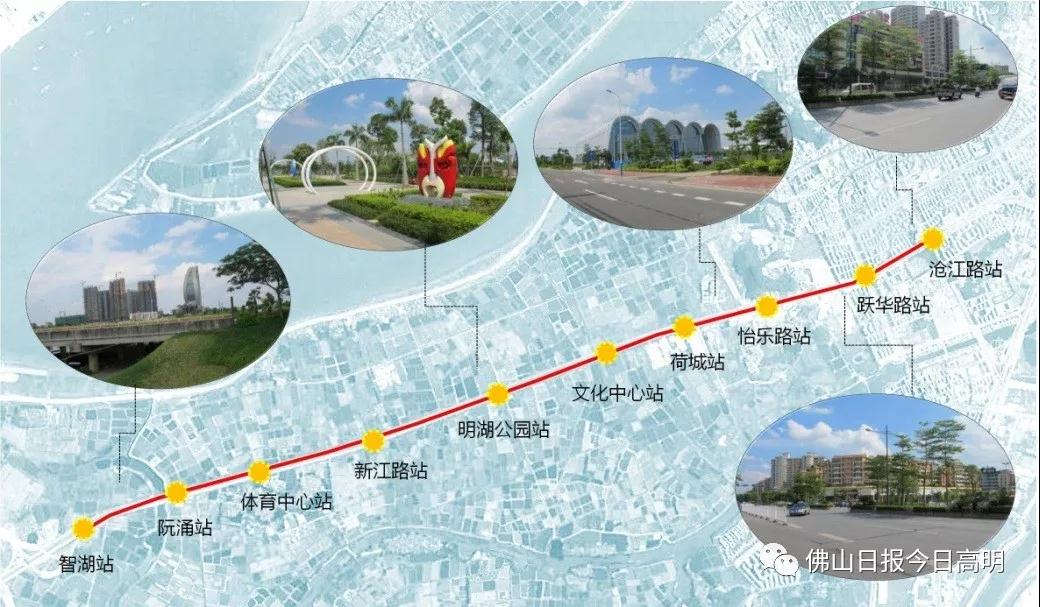 佛山市高明区现代有轨电车示范线于2017年2月27日正式动工,首期全长6.57公里,平均站间距约640米,10座站点分别为: