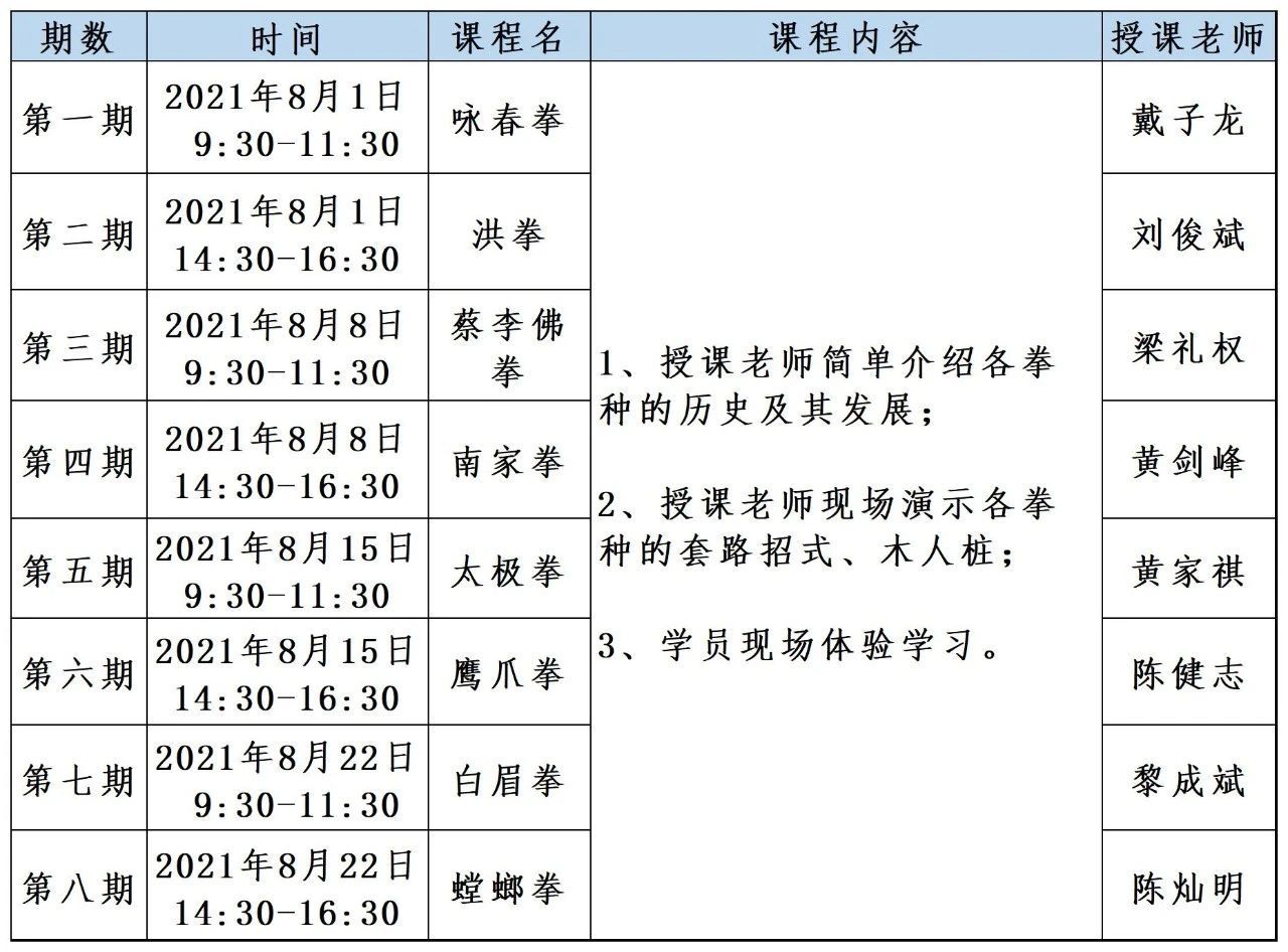 据主办方负责人介绍,课堂上,相关拳种的传人将通过介绍拳种历史以及武术展示,让佛山青少年对佛山功夫有基本的了解。每期活动限15个名额,年龄为7-14岁的中小学生均可报名,一名学生需一名家长全程陪同;每个报名者最多报两期,报满即止。
