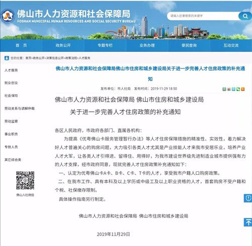 刚刚,佛山市人力资源和社会保障局与佛山市住房和城乡建设局联合发布完善人才住房政策补充通知,明确在佛山工作、具有本科及以上学历或中级工及以上职业资格的人才,首套购房不受户籍和个税、社保缴存限制。