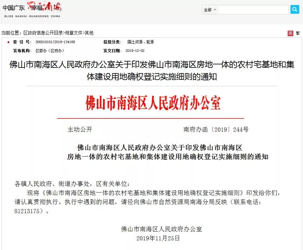 广东省自然资源厅今年5月发布《关于开展房地一体的农村宅基地和集体建设用地确权登记试点工作的通知》,南海区被确定为全省七个该项试点工作地区之一。按照部署安排,确权登记工作于2019年11月底全面展开。