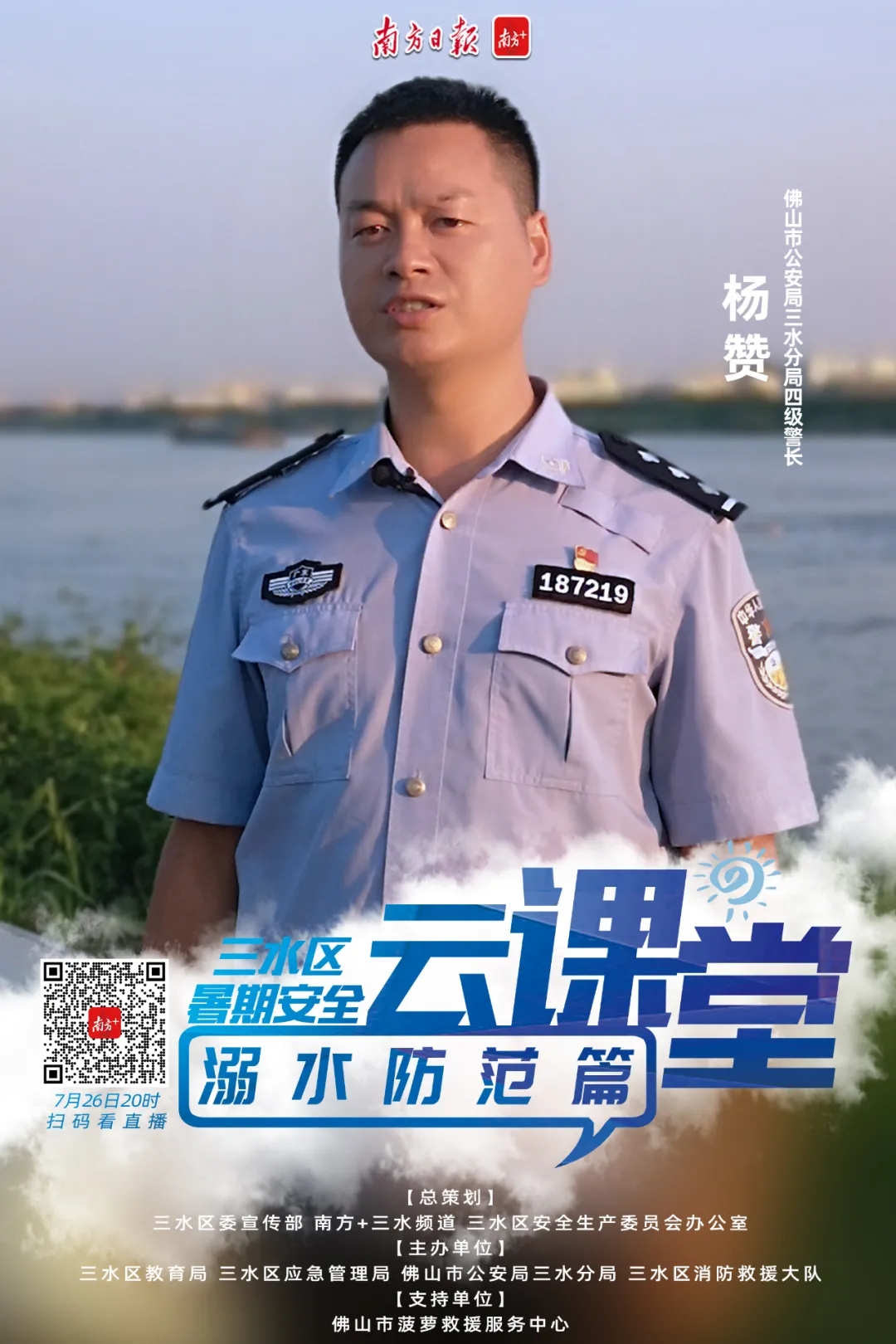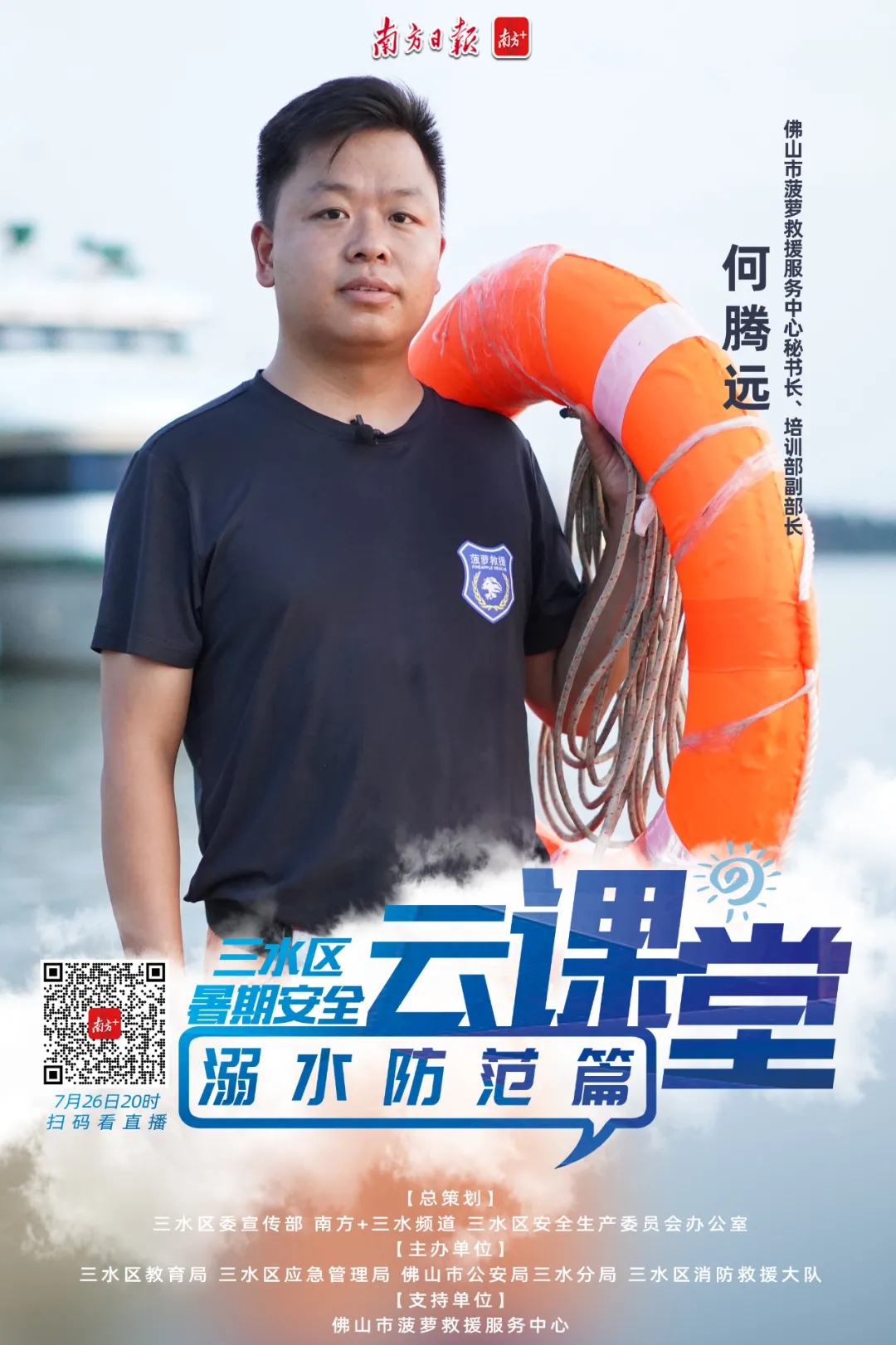平安三水,安全相伴,开心暑假!三水区中小学生暑期安全云课堂将正式开讲,首期将播出《溺水防范安全教育公开课》。在直播过程中,佛山市公安局三水分局四级警长杨赞将讲解野泳的危险性,介绍近期三水发生的溺亡案例和常见溺水事故原因。佛山市菠萝救援服务中心秘书长、培训部副部长何腾远也将带领队员实地示范正确的岸基救援和自救等方法,进一步增强全区师生及家长溺水防范安全意识。