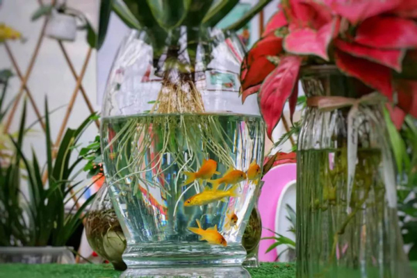 袖珍花园里长满了小巧玲珑的各色花草。瓶上种花、瓶里养鱼的别致造型让人眼前一亮。