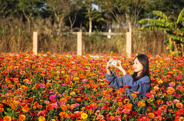 一簇簇百日草色彩艳丽,华美热烈。人在花丛中,仿佛在画中!