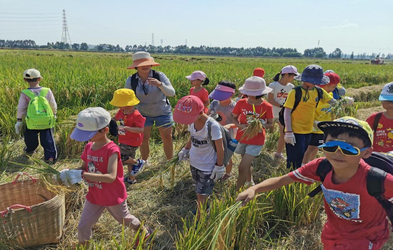 烈日炎炎下,体验割禾。孩子们有模有样,戴着手套,拿起镰刀,认真割稻谷,看着简单,却也要付出一定的力气才能割下稻谷。拿着自己亲手割下的稻谷,孩子们都露出了喜悦的笑容。