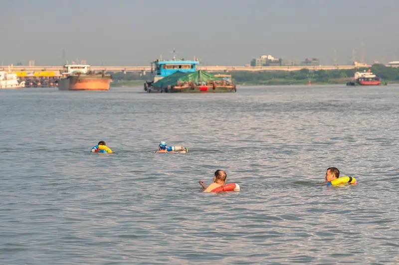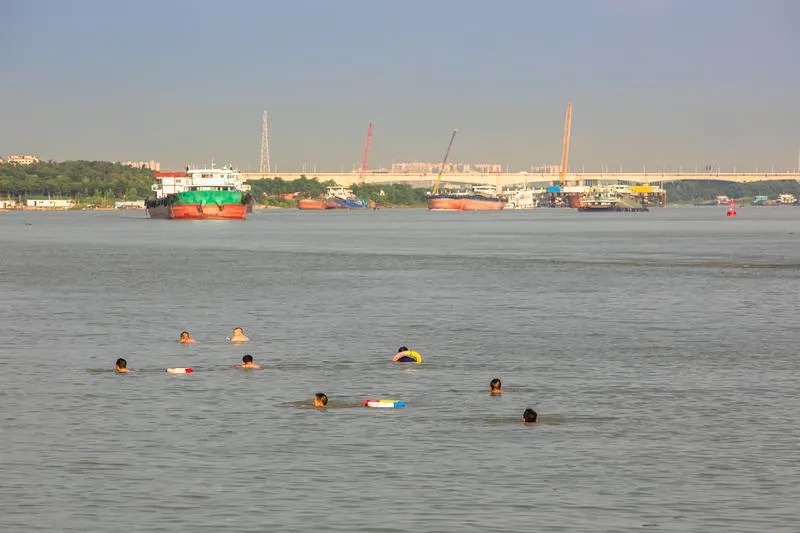 位于三水区西南街道的东平水道上,市民们正在河里游泳。/佛山日报记者王澍摄