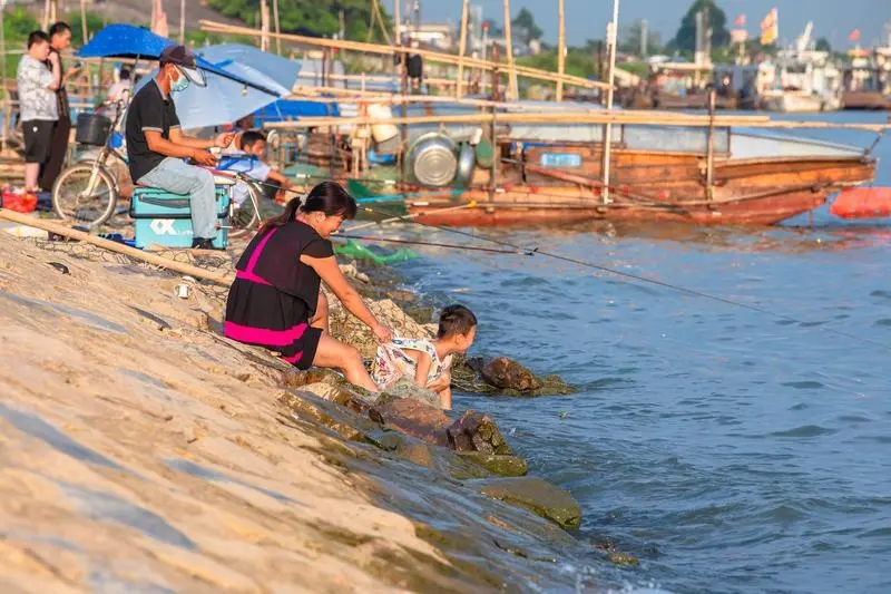 位于三水区西南街道的东平水道上,一位小朋友正在河边玩水,他的家长正死死拉住他的衣服,防止他掉进水里。/佛山日报记者王澍摄