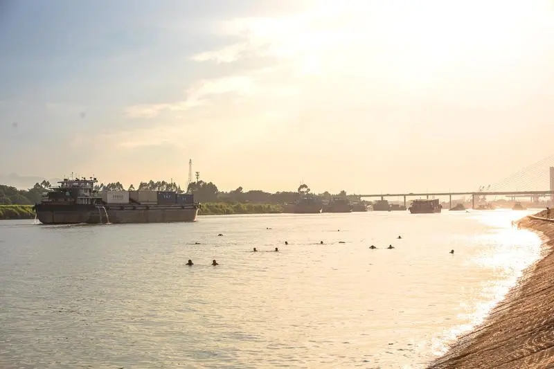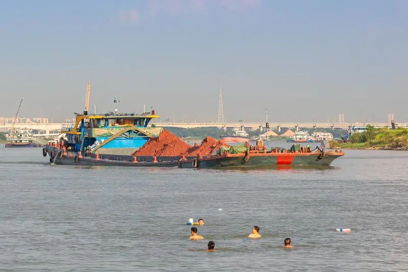 位于三水区西南街道的东平水道上,市民们正在河里游泳,他们的身躯在轮船面前显得特别渺小。/佛山日报记者王澍摄