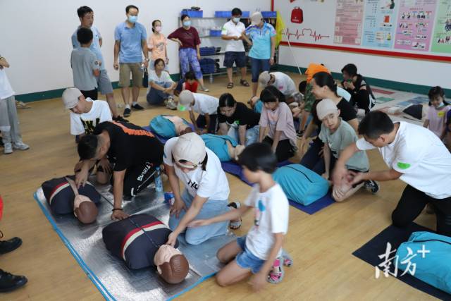 孩子们在专业导师的指导下学习心肺复苏的正确做法。
