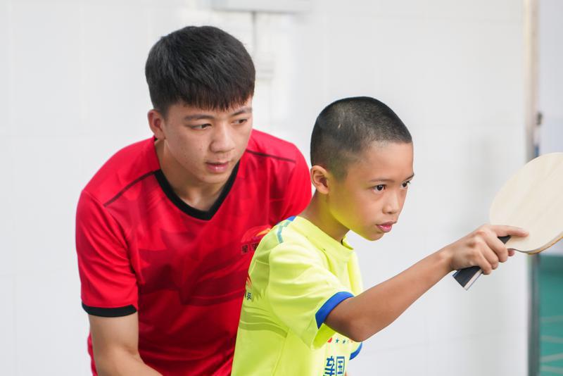 7月27日,三水区北江小学开展暑期托管服务。乒乓球教练正指导学生练习。/佛山日报见习记者黎均洋摄