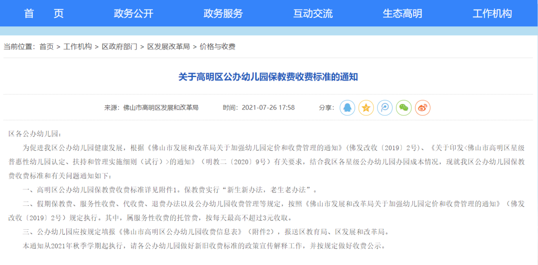 《关于高明区公办幼儿园保教费收费标准的通知》