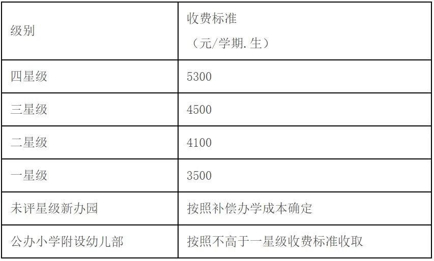 此外,对于未评星级新办园就按照补偿办学成本确定,而公办小学附设幼儿部则按照不高于一星级收费标准收取。