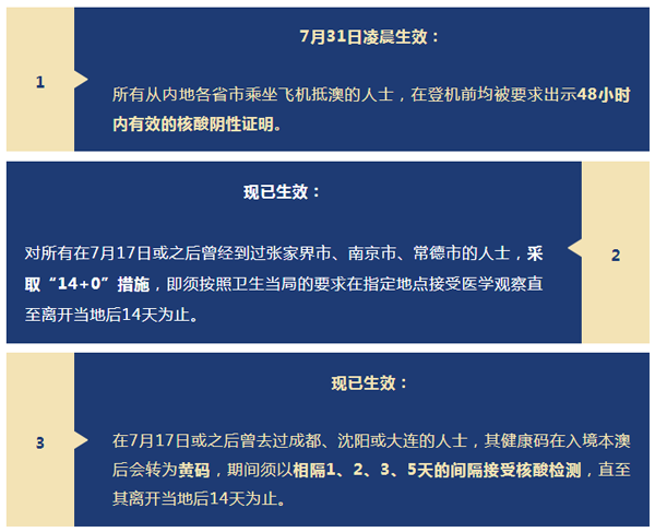 最新公布的防疫措施是因应疫情而收紧,包括要求由内地不同省市乘坐航班直达澳门的人士,上机前需持48小时内有效的阴性核酸检测证明,并扩大中高风险地区定义的范围,由过往只对针对内地某一小区、某一街道或某一行政区,而转变为将整座城市均定义为中高风险,这都是因应疫情变化而作出较大的改动。
