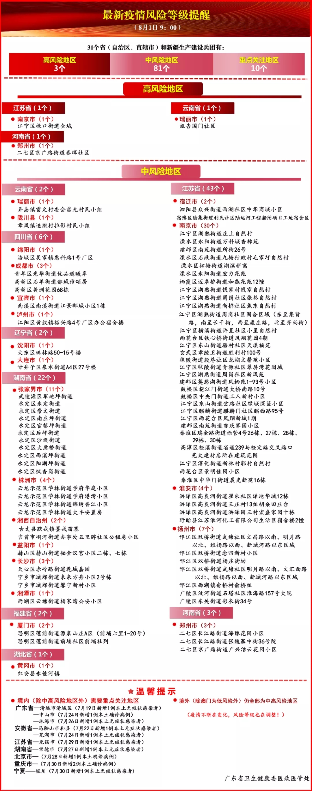 截至8月1日9:00,全国共有3个高风险地区,81个中风险地区,需重点关注地区10个。