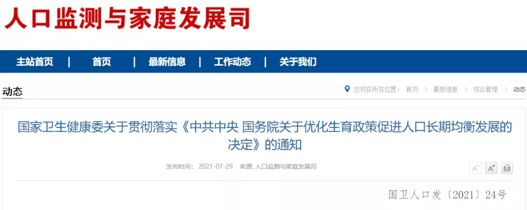7月29日,国家卫生健康委发布关于贯彻落实《中共中央 国务院关于优化生育政策促进人口长期均衡发展的决定》的通知。其中提到,依法实施三孩生育政策,取消社会抚养费,清理和废止相关处罚规定,将入户、入学、入职等与个人生育情况全面脱钩。