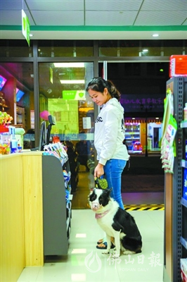 市民小娟带着爱犬在小区楼下的商店里选购商品。小娟每次出门都会给自己的边境牧羊犬拴上犬绳戴上嘴套。/佛山日报记者王澍摄