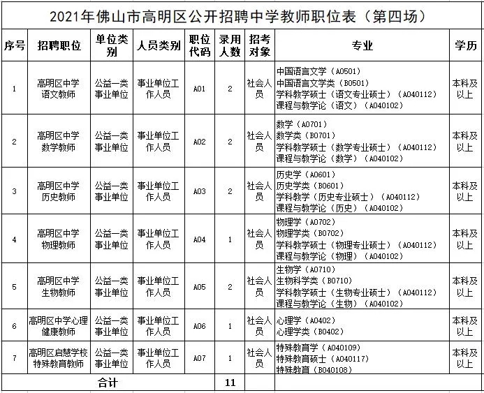 招聘职位包括:高明区中学语文、数学、历史、物理、生物、心理健康、特殊教育等7个学科共11名教师,属事业编制(公益一类)工作人员。具体职位表如下: