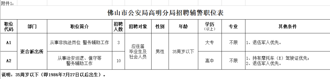 (三)勤务辅警应当具有高中以上文化程度,文职辅警应当具有大专以上文化程度,专业性较强的岗位应当获得岗位需要的专业资质或者专业技能。详见《佛山市公安局高明分局招聘辅警职位表》(附件1);