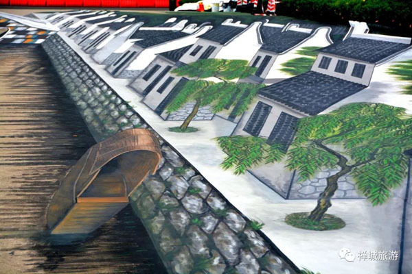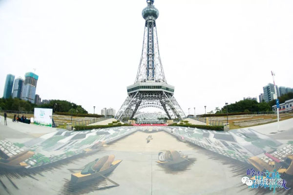 电视塔下还有一幅岭南水墨画风格的地画。它占地面积达700平方米,由一万只脚印构成。青砖、石柱建起的“镬耳屋”、岭南水乡……满满佛山文化元素。