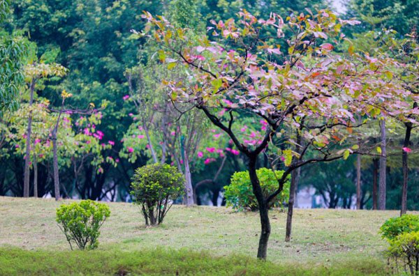 杨和镇中心城区绿化公园内的树木绿意盎然/吕润致摄