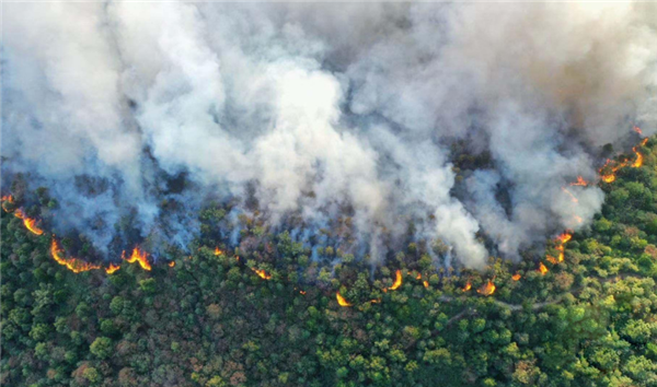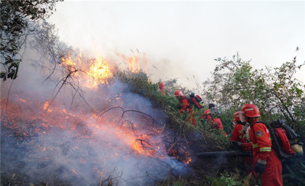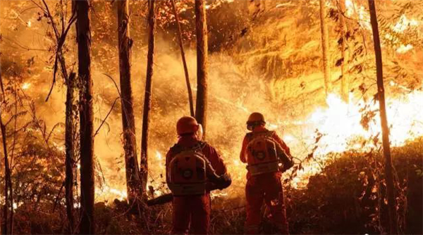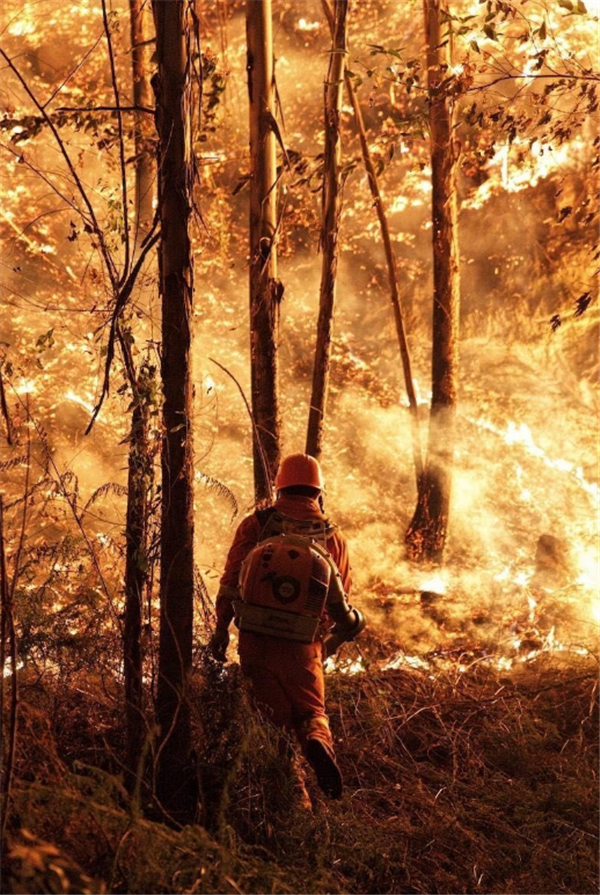 消防战士们向火而行与熊熊山火展开搏斗的身影
