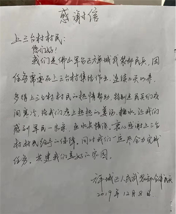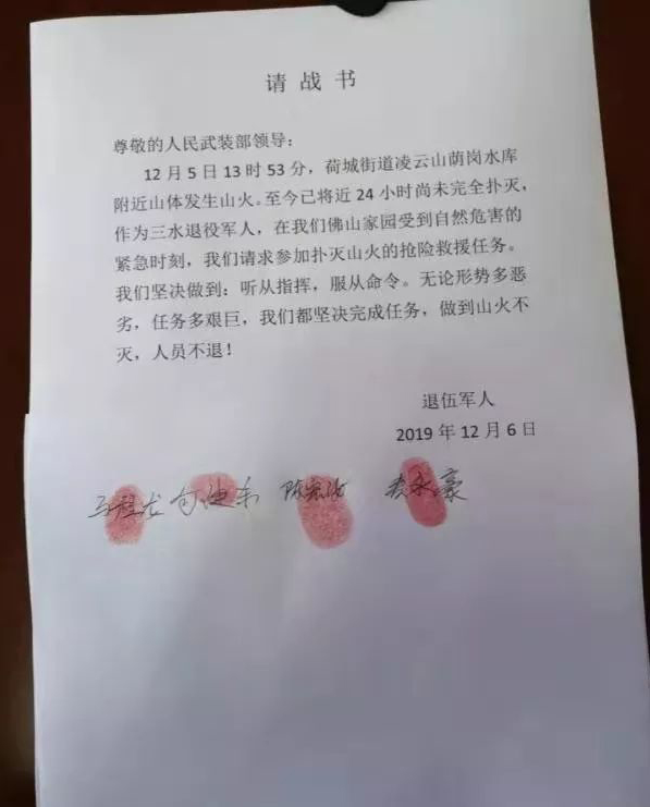 “一日为军人、终身为军人,我们坚决做到:听从指挥,服从命令。无论形势多恶劣,任务多艰巨,我们都坚决完成任务,做到山火不灭,人员不退!”危急时刻,佛山市三水区退伍老兵马程龙写下请战书,和昔日战友一起按下手印,用实际行动守护佛山家园。