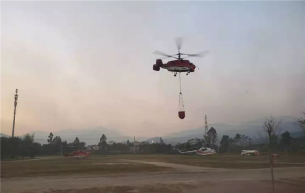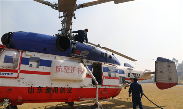 山东通航赶到山火现场,在连续灭火数小时后,降落在盈香生态园加油及检修。