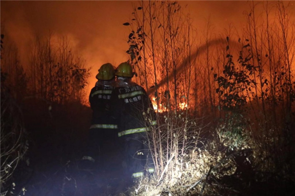 来自英德东华镇的消防队员正在扑灭大面积的烈火