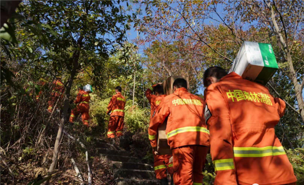 福建南平森林消防队伍午间将饭菜等物资人工搬运至山顶,山路陡峭,物资沉重,挡不住救援队伍的脚步。