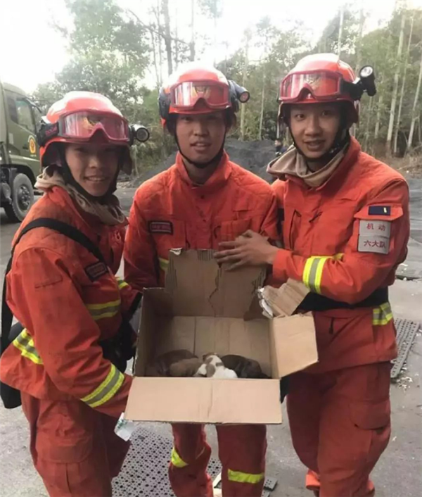 救火过程中,消防员在扑打火苗的时候,听到有小狗叫的声音,于是顺着声音找到了趴在草丛中的一窝小狗,消防员连忙把小狗抱在怀里,希望可以消除它们因大火带来的恐惧感。