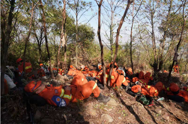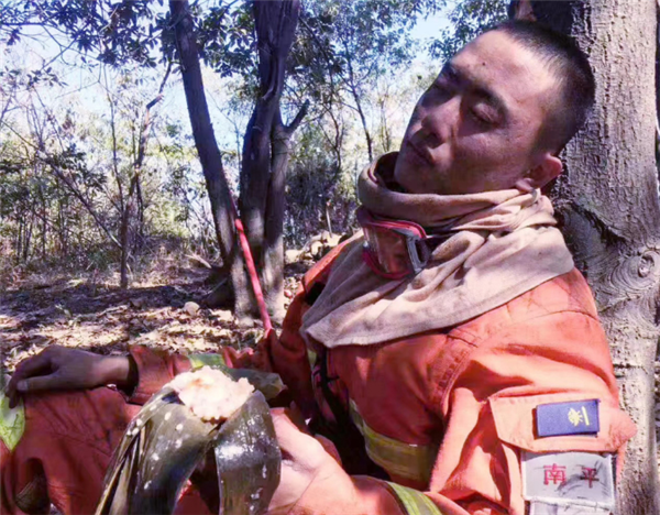 以天为被,以地为席,消防队伍在山间稍作休息,倒地就睡。