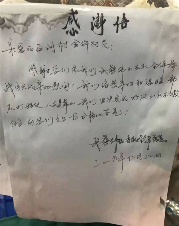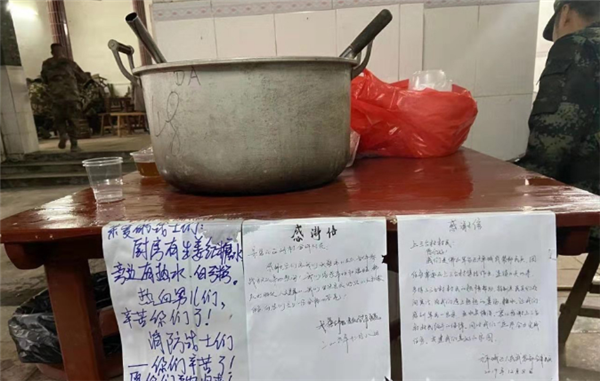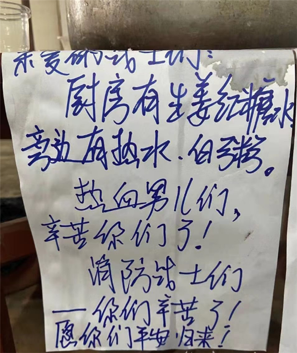当地一早餐店老板为中山消防救援支队奋战在一线的消防员们送来鸡蛋、饺子、汤粉等早餐,并在保温盒盖上写上一句温韾的关心问候的话:消防员们加油,你们辛苦了。