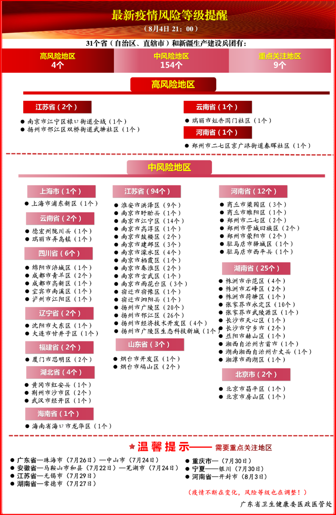 8月3日,广东疾控发布最新提醒称,根据江苏省淮安市官方发布:7月29日-8月1日,江苏省淮安市分别报告新增本土个案4、1、4和3例(累计共12例)。其中10例曾一起到湖南省张家界市旅行,7月27日返回淮安洪泽;另2例为上述病例的家庭密切接触者。