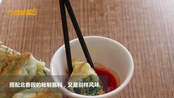 北香园的饺子馅由3分肥肉 7分瘦肉混合搭配而成表皮则煎至金黄色