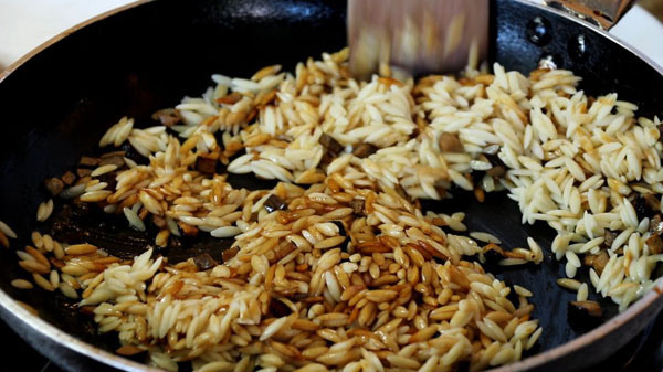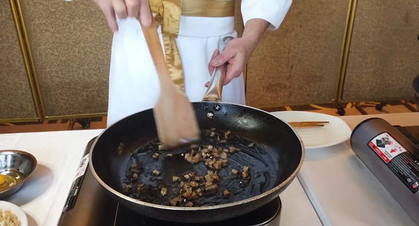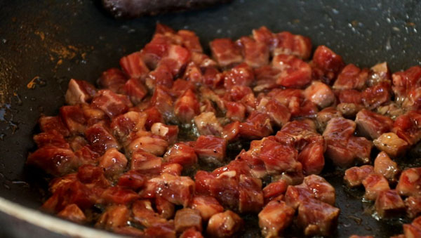 牛肉、米面入锅爆炒,米面炒至金黄色。