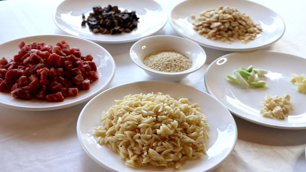 辅助材料加入爽口的米面。这种米面非常特别,由米酱磨成后,制作成“米饭状”,但粒粒分明,不会粘连,具有弹性。
