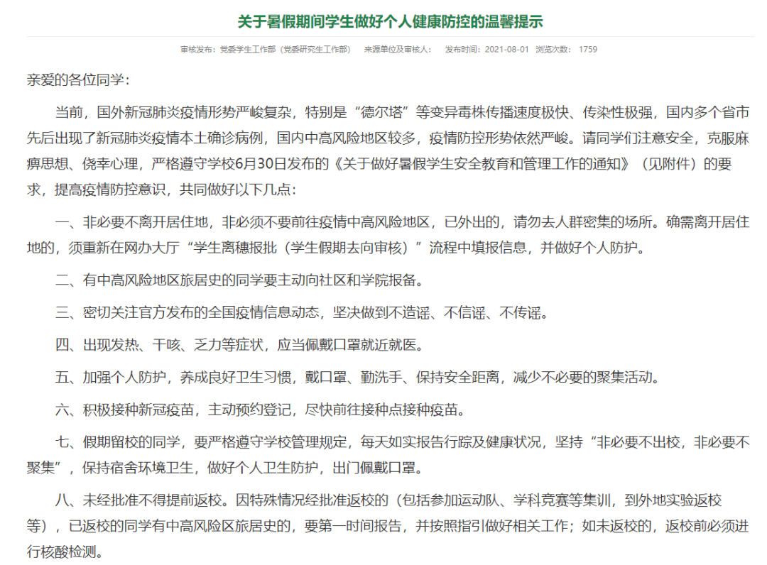 8月1日,华南农业大学发布通知,未经批准不得提前返校。