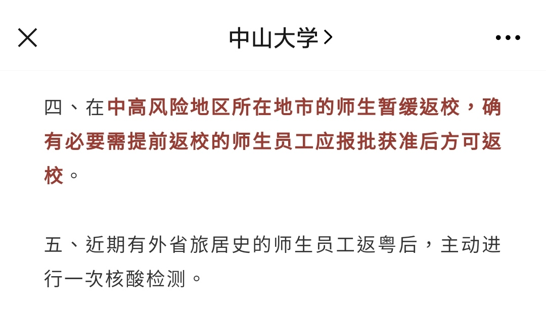8月2日,中山大学发布通知,在中高风险地区所在地市的师生暂缓返校,确有必要需提前返校的师生员工应报批获准后方可返校。