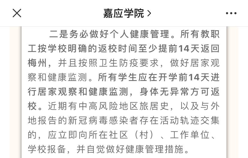 8月1日,嘉应学院发布致全体师生员工的一封信,所有教职工按学校明确的返校时间至少提前14天返回梅州,并且按照卫生防疫要求,做好居家观察和健康监测。所有学生应在开学前14天进行居家观察和健康监测,身体无异常方可返校。
