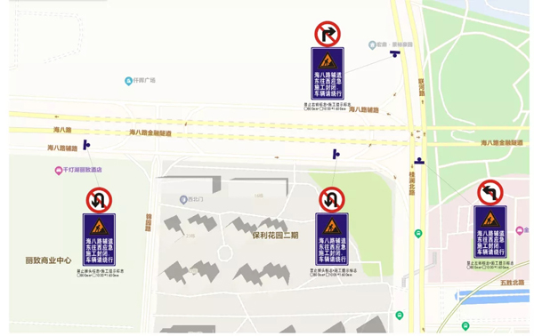 封闭路段为:桂澜路南往北封闭左转进去海八路辅道,桂澜路北往南封闭右转进入海八路辅道,封闭路段禁止车辆驶入。