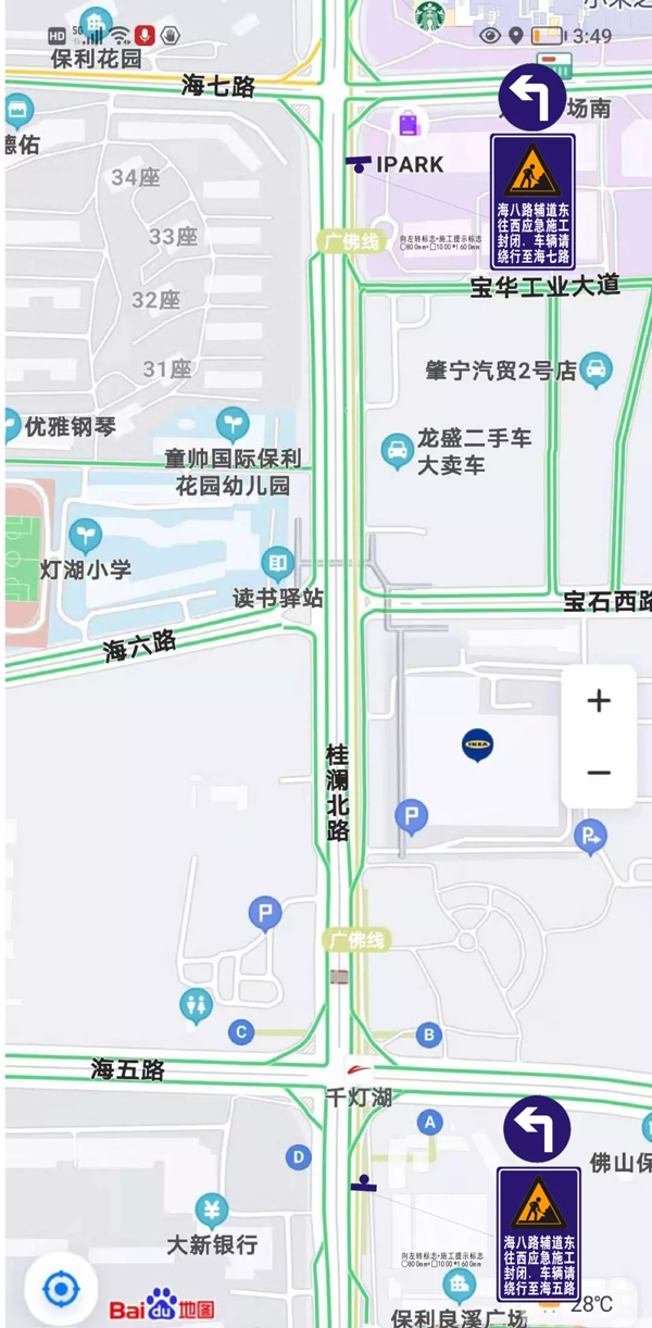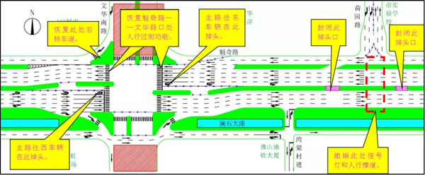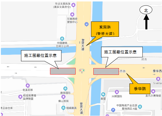 因施工需要,季华路东行、西行路口车道由7车道压缩为4车道,并封闭东侧人行道,具体行车指引: